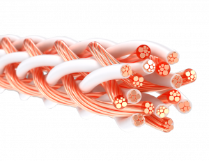 16 strands of 19.5 AWG OFE (oxygen free electrolytic) copper with industry leading conductivity. (102% IACS).